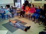 Une infirmière et un pompier sont venus nous expliquer comment réagir face à une personne inconsciente. Tout d’abord, vérifier si elle respire encore. Si ce n’est pas le cas, demander à une personne d’aller chercher le défibrillateur et de sonner au 112. Pendant ce temps, faites-lui un massage cardiaque. Appuyez 30 fois sur le thorax et ensuite soufflez deux fois dans la bouche. Quand vous avez le défibrillateur ; ouvrez-le, appuyez sur ON, posez les électrodes sur la personne inconsciente, branchez-les sur l’appareil et reculez pour éviter l’électrocution. Quand le défibrillateur est prêt, vous pouvez « choquer ». Ensuite refaites le massage cardiaque. Recommencez jusqu’au moment où l’ambulance arrive.